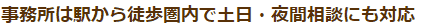 公共交通機関を使ってお越しいただきやすい環境であるほか、どの事務所も近くの駐車場をご利用いただけるため、お車でもお越しいただきやすくなっています。