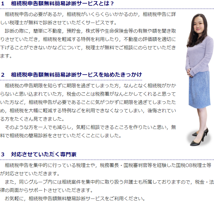 ご自分の場合において相続税の申告が必要かどうかお悩みの方は、当法人の無料簡易診断サービスをご利用ください。